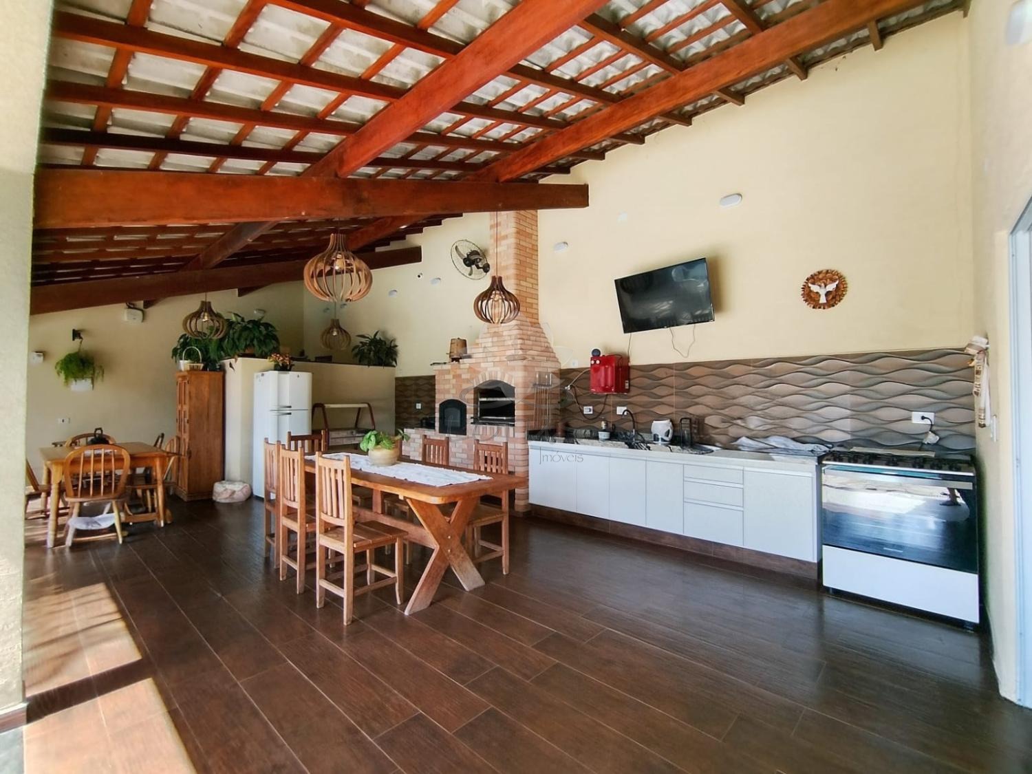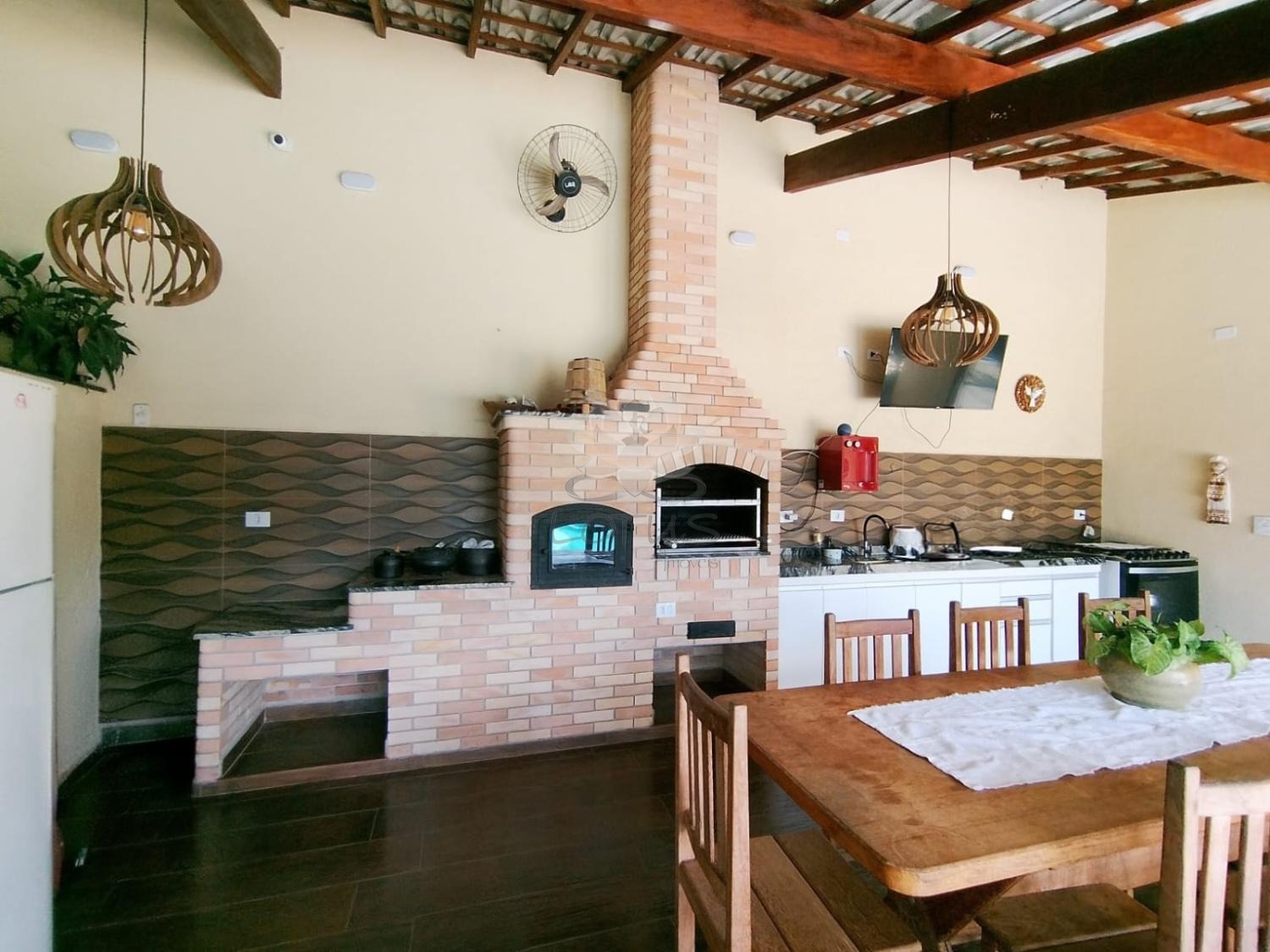 ◼área gourmet com churrasqueira, forno a lenha e fogão a lenha.